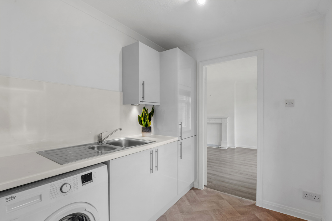 The newly fitted kitchen is both sleek and practical, with integrated oven, hob, and extractor, complemented by modern under-cabinet lighting, splashback tiling, and herringbone-inspired flooring. The kitchen enjoys pleasant open aspect views over the green area to the back — a lovely setting for everyday living.