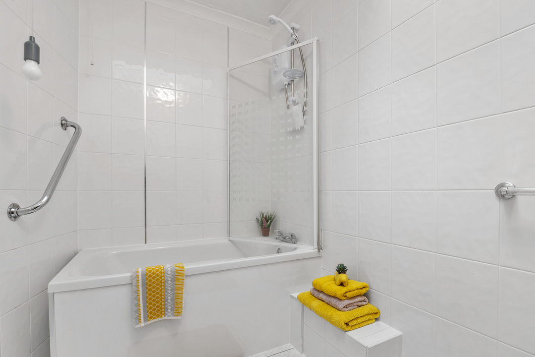 The modern bathroom includes a bath with over-bath shower, creating a fresh and functional space.