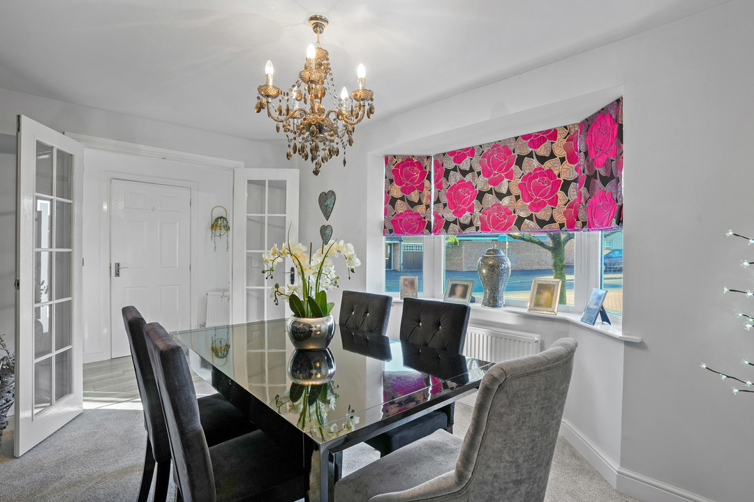 A formal dining room accessed through double doors from the main hallway, complete with a beautiful bay window. A superb space for hosting family gatherings, celebrations or dinner parties.