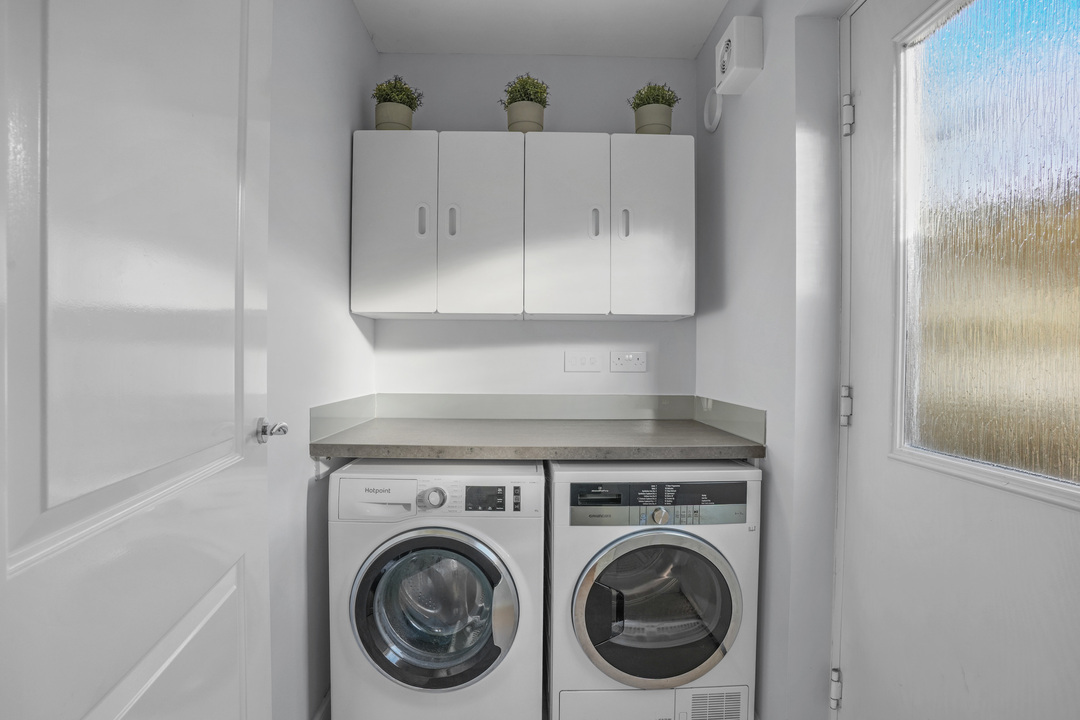 A utility room, with space for a washing machine and dryer, provides direct access to the garden, while a WC completes the ground floor.