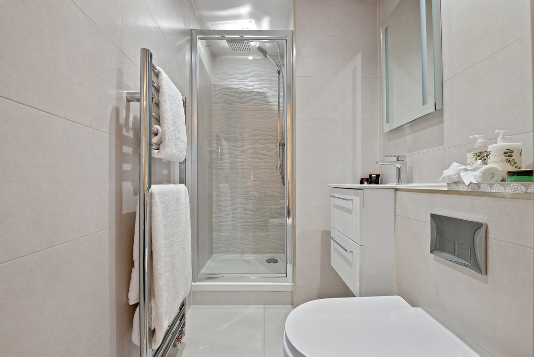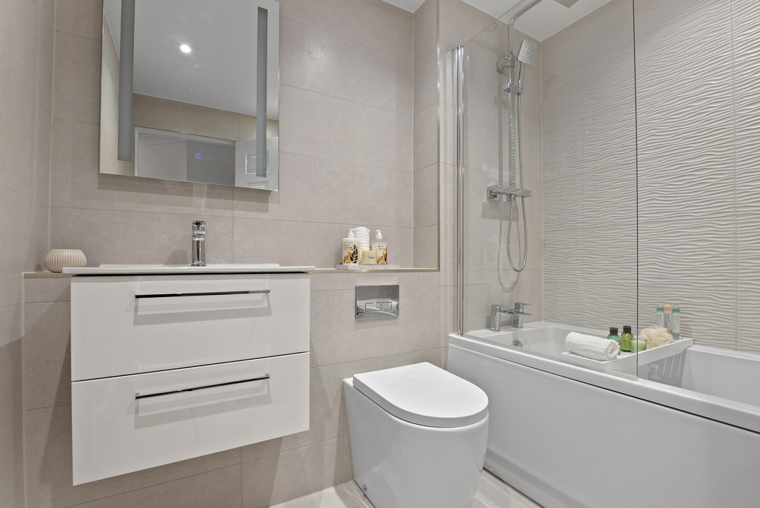 The main bathroom mirrors the same high-quality finish, featuring a bath with overhead rain shower, handheld attachment, and under-sink storage. Finished in elegant muted grey tiling, it has a spa-like feel — the perfect place to unwind after a busy day.