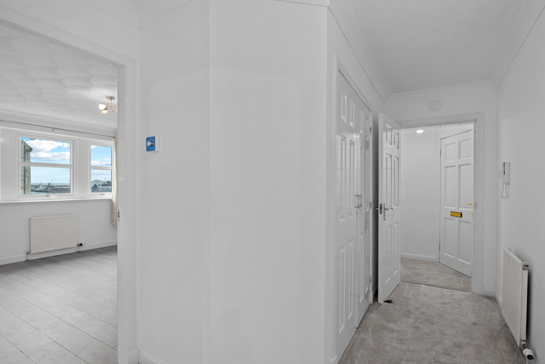 This immaculate flat sits on the first floor above the archway leading into the private parking courtyard and is accessed via a secure entry system. Upon entering, a small entry area provides the perfect spot for coats and shoes before stepping into the welcoming hallway, which features plush new carpeting and a large double storage cupboard.