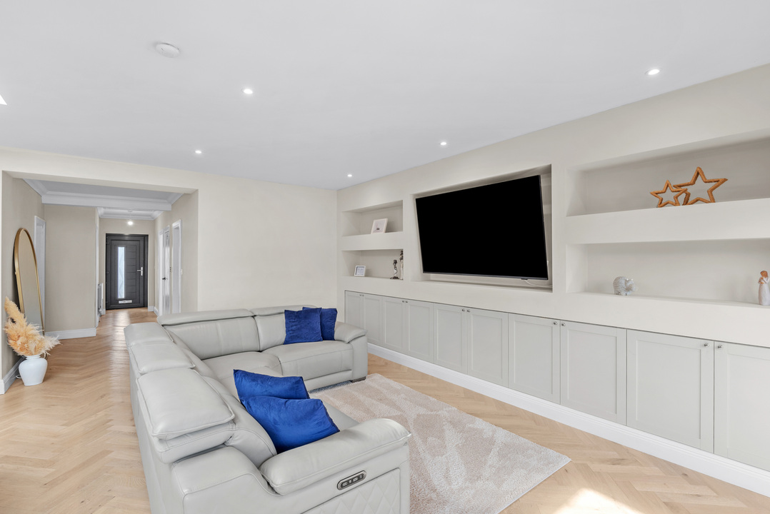 From the moment you step inside, the warmth of herringbone wooden flooring guides you through to the show-stopping heart of the home – a contemporary open-plan kitchen, dining and family room.