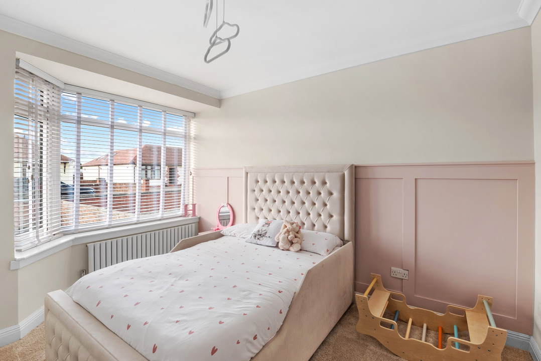 • Bedroom Two – double-sized, with fitted wardrobes, feature wall panelling, and a walk-in cupboard plumbed for an en-suite.