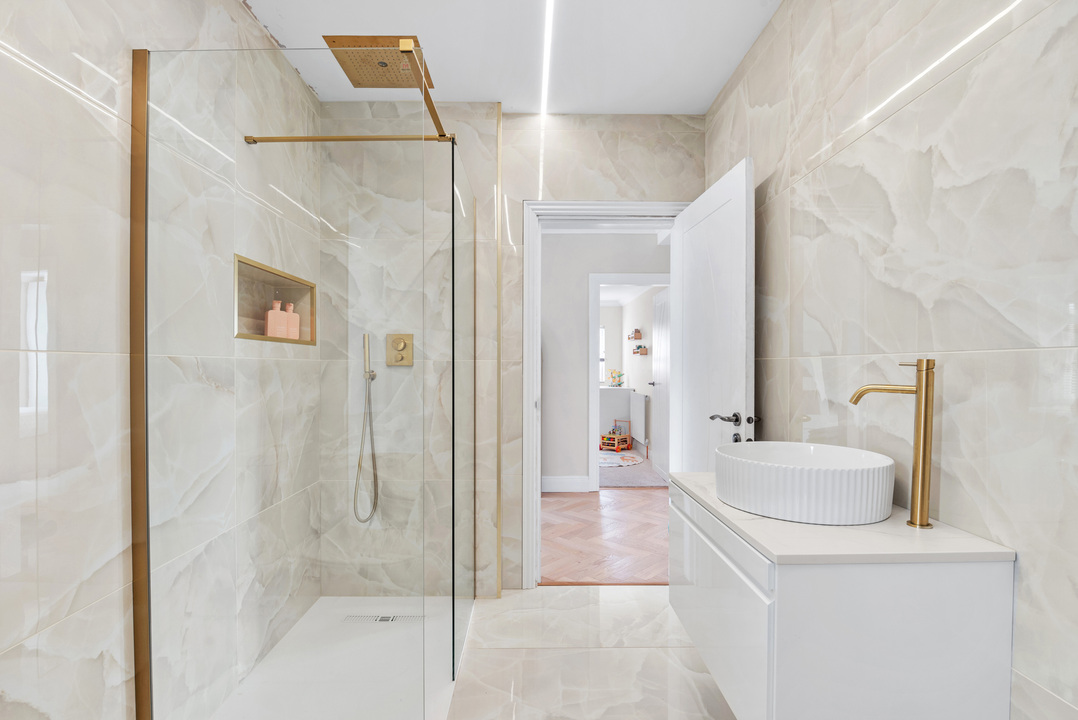 The luxury family bathroom has been designed as a calming retreat, featuring: